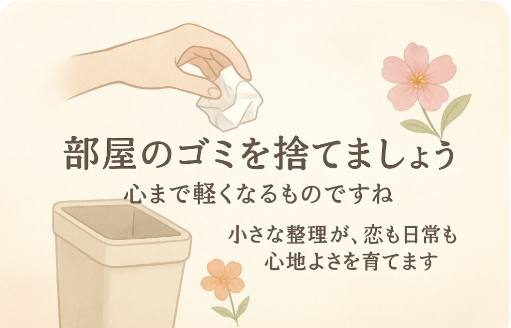 ゴミを捨てるという日常の小さな行動は、自分を大切にする時間でもあります。整った空間は、自分の心に余裕を与え、恋をする気持ちにも優しい風を吹き込んでくれるでしょう。